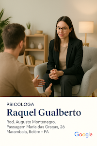 "A Psicóloga Raquel Gualberto atende em Belém-PA com foco em Terapia Cognitivo-Comportamental (TCC), oferecendo acompanhamento terapêutico para adolescentes, adultos e casais. Realiza avaliação psicológica e neuropsicológica com objetivo clínico e diagnóstico. Atua no tratamento de ansiedade, depressão, autoestima, luto e dificuldades nos relacionamentos. Atendimento presencial em consultório e também online para maior comodidade. Agende sua consulta e cuide da sua saúde emocional com uma psicóloga ética, acolhedora e especializada. Endereço: Rod. Augusto Montenegro, Passagem Maria das Graças, 26 – Marambaia, Belém – PA WhatsApp: (91) 98076-6563"